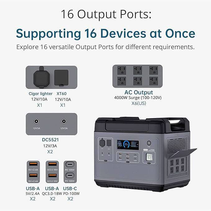(salidas AC 110V, USB-A y USB-C carga rápida, carga inalámbrica, DC, encendedor de coche, etc.)